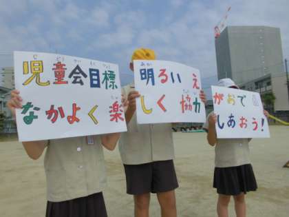 「明るいえがおで なかよく楽しく 協力しあおう」です。1年間この目標のもとに、6年生が中心となって児童会を盛り上げていきます。