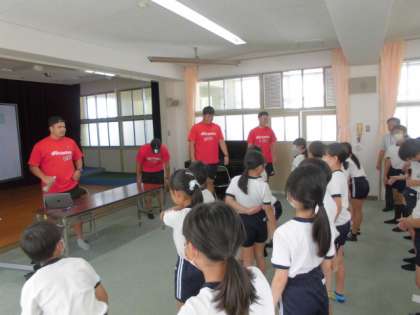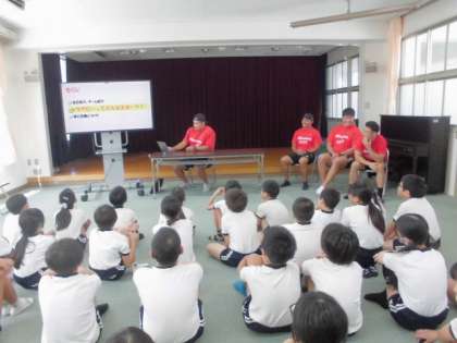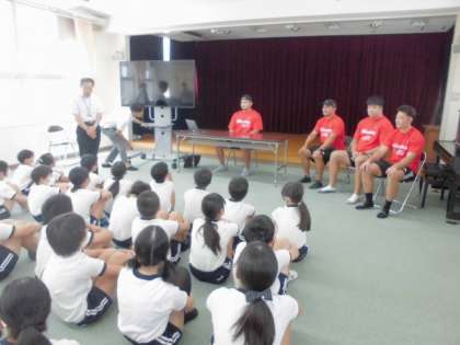 トップアスリートによる「夢・授業」として、ラグビーチーム「レッドハリケーンズ大阪」の方が来てくださいました。「夢・授業」はトップアスリートが講演や実技指導を通じて、児童の「夢」を育み、体力の向上を図るものです。2時間目は、アスリートの方の生い立ちを知り、夢をもつことの素晴らしさを聞きました。