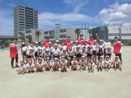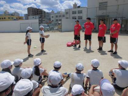 終わりにみんなで記念写真を撮ってあいさつをしました。お土産にラグビーの下敷きとサイン色紙をいただきました。
