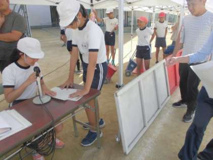 5、6年生が、6時間目に運動会前日準備をしました。各係で最終打合せや実際の動きを確認しました。仕事内容の確認が終わった児童は、石拾いをしたり机やいすを運んだりしました。