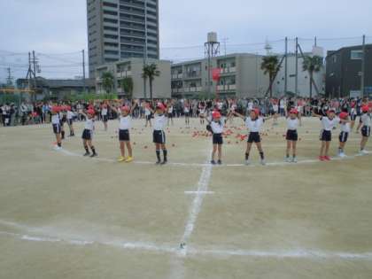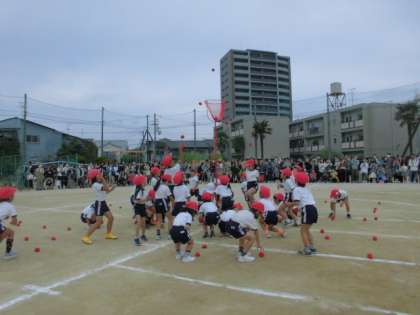 ダンスをして音楽が止まると玉入れをします。音楽が流れると玉入れをやめて、またダンスをします。