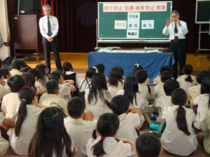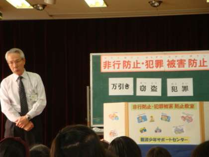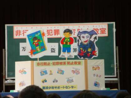 警察と教育委員会の方に来ていただき、お話を聞いたり、万引きをテーマとした人形劇を見せていただいたりしました。