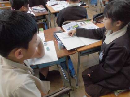 3年生は算数で「1より小さい数」を学習しました。今まで学習してきたことを思い出し、「1より少ない量」について自分が考えたことをペアで話し合いました。入れ物のメモリに着目していました。