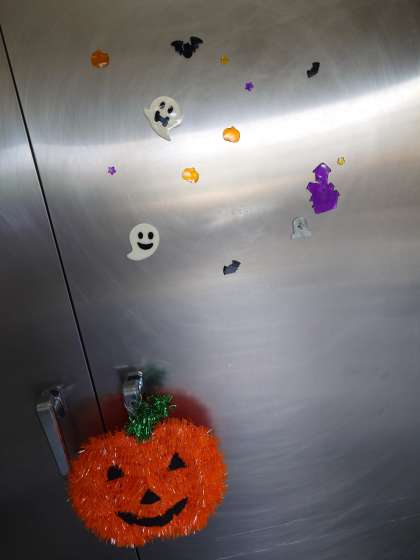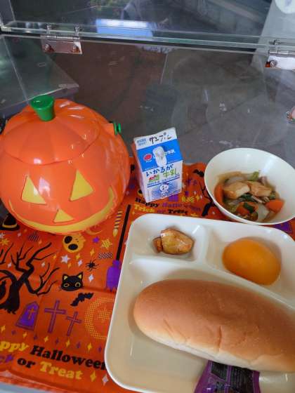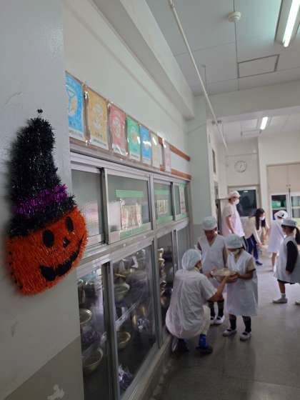 給食室では、ハロウィンに合わせてかわいい掲示物が飾ってあります。