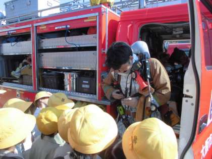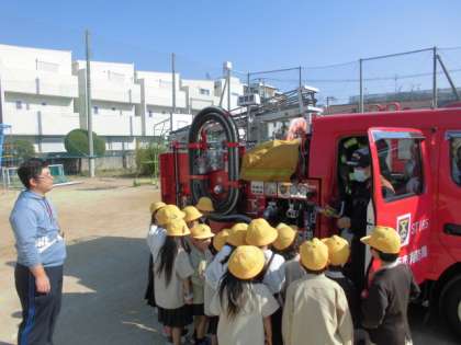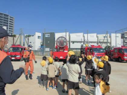 消防車見学、ブロアー体験の様子です。消防士さんが消防自動車のことをいろいろ教えてくれました。ブロアーは風の力で火を消します。「とばされるー」と1年生の子が踏ん張っていました。