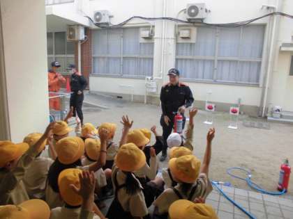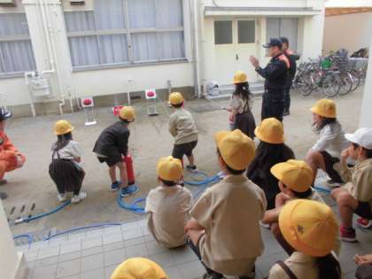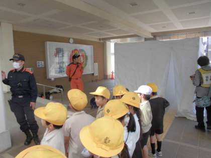 煙体験、水消火器体験の様子です。煙が充満しているテントの中へ、姿勢を低くして入りました。水消火器体験は、とても上手に火の的をねらえてました。