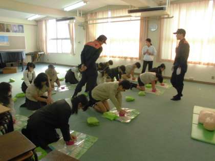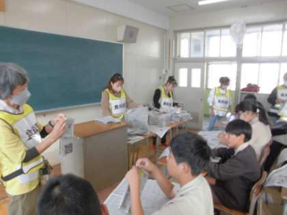 心肺蘇生法と紙皿作りを学びました。心肺蘇生法では、小さな心臓のモデルを使って体験しました。また、新聞紙を使って「スリッパ」「紙皿」をつくりました。