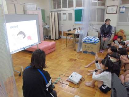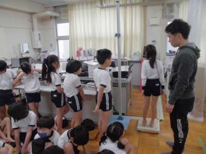 3、4年生の体重測定をしました。昨日は1、2年生、一昨日は5、6年生でした。測定をする前に、つきゆび、すりきず、鼻血などの応急処置の仕方を学びました。「すぐに冷やす」「動かさない」など、処置の仕方を知っている子が何人かいました。