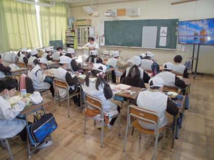 給食委員会の児童が毎日「今日の献立」を放送で知らせています。当番の児童は5年生と6年生がペアを組んでいます。1回練習をしてから放送をするので、給食委員会の児童はみんなとても上手です。