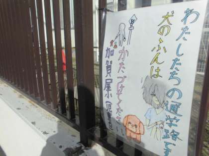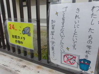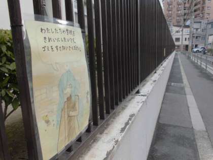 学校のまわりの柵に、学校からのお願いのポスターを貼りました。児童がつくってくれたものです。学校の周りにごみを捨てたり、犬の糞がそのままになったりしないように、願いを込めました。