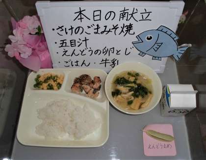 食材には、おもにエネルギーのもとになる黄色の食べ物が4種類、おもに体をつくるもとになる赤色の食べ物が8種類、おもに体の調子を整える緑色の食べ物が5種類使用されています。