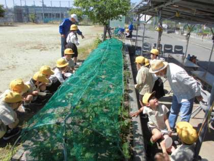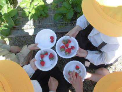 加賀屋子ども農園でイチゴ狩りをしました。イチゴは地域の方が育ててくださったものです。子どもたちは楽しくイチゴを摘み、その場で美味しく頂きました。イチゴが苦手な子も「全部食べたよ。おかわりもした!」と嬉しそうな顔を見せていました。