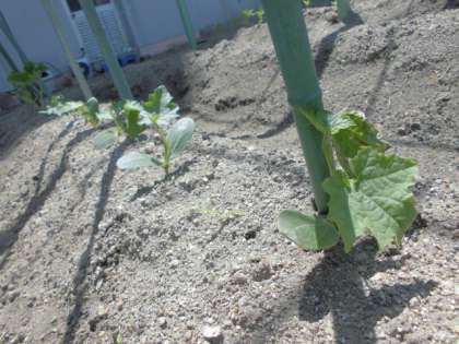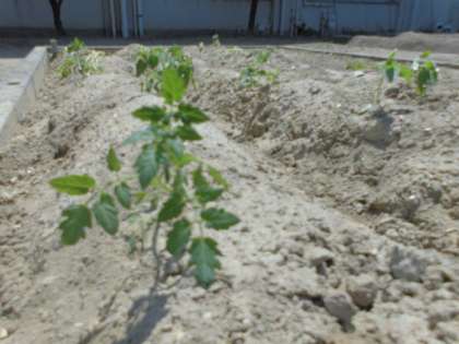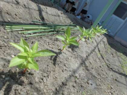 春の学習園。苗や種が植えられています。ナス、シシトウ、ヘチマ、ホウセンカなど。育ってくると、学習園が、にぎやかになってくるので楽しみです。