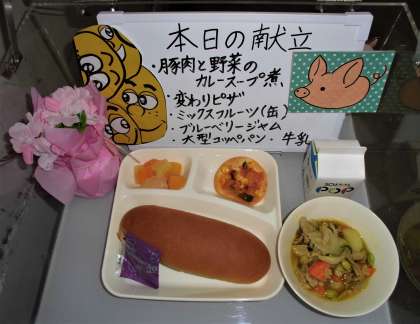 食材には、おもにエネルギーのもとになる黄色の食べ物が6種類、おもに体をつくるもとになる赤色の食べ物が4種類、おもに体の調子を整える緑色の食べ物が8種類使用されています。
