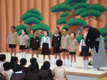 全員で謡に挑戦したり、能に使う楽器を教えていただいたり、代表者8名が能面を体験したりしています。