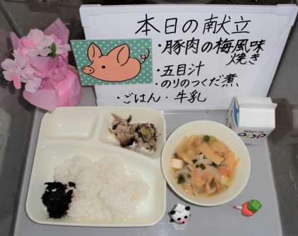 食材には、おもにエネルギーのもとになる黄色の食べ物が2種類、おもに体をつくるもとになる赤色の食べ物が8種類、おもに体の調子を整える緑色の食べ物が7種類使用されています。