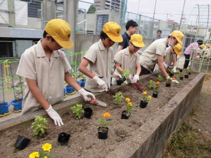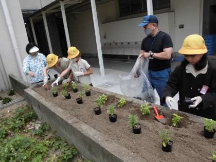 「花咲かせ隊」の方々と5年6年生の有志28名の子どもたちが学習園の花壇に苗を植えました。何人かの子どもは「毎年参加してるから今年もやるわ」と今や恒例行事となっています。地域との交流ということで、お話しながら和やかに苗を植えました。