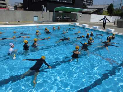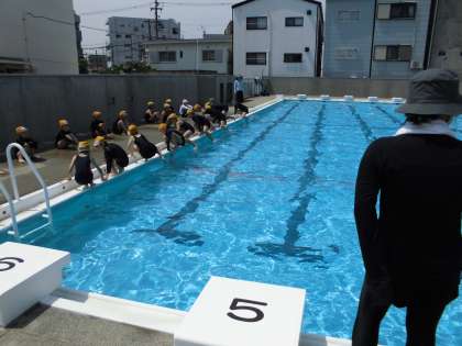 4年生のプール学習です。水慣れ、けのび、ビート板を使ったバタ足、クロールなど、2回目のプールなので段々慣れてきていました。暑くなってきたので、とても気持ちよさそうでした。