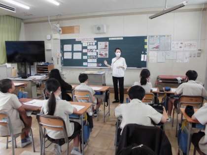 他校から講師の先生を招き、栄養について学習をしました。「バイキング給食にチャレンジしよう!」ということで、主食・主菜・副菜・その他の4つを自分たちで考えて給食メニューをつくりました。1年生から栄養教育で多くのことを学んできた6年生なだけに、しっかりバランスの取れたメニューを考えていました。、