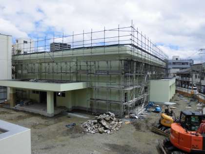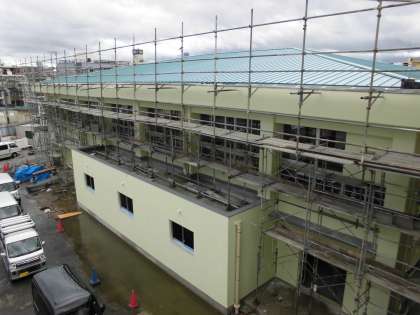 周りを囲んでいた青いシートがすべてはずされました。現れたのは薄い緑色のきれいな新しい壁です。これを見て思わず「おっ」と声が出てしまいました。