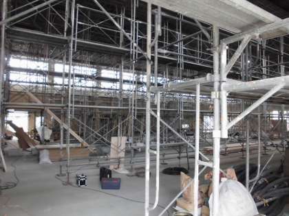 先週、やっと姿をあらわした体育館は、足場が取り払われてさらに存在感が増してきました。一番下の写真は体育館内部です。