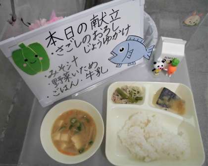 食材には、おもにエネルギーのもとになる黄色の食べ物2_種類、おもに体をつくるもとになる赤色の食べ物が8種類、おもに体の調子を整える緑色の食べ物が7種類使用されています。