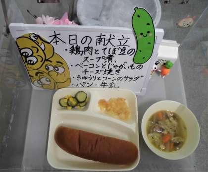 食材には、おもにエネルギーのもとになる黄色の食べ物が4種類、おもに体をつくるもとになる赤色の食べ物が5種類、おもに体の調子を整える緑色の食べ物が7種類使用されています