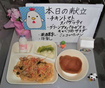 食材には、おもにエネルギーのもとになる黄色の食べ物が5種類、おもに体をつくるもとになる赤色の食べ物が4種類、おもに体の調子を整える緑色の食べ物が7種類使用されています。
