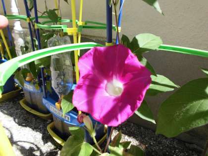 1年生が毎朝毎朝、一生懸命水やりしているアサガオが先週あたりから花を咲かせるようになりました。これからも水やりがんばってほしいです。