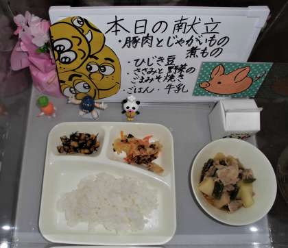 食材には、おもにエネルギーのもとになる黄色の食べ物が7種類、おもに体をつくるもとになる赤色の食べ物が7種類、おもに体の調子を整える緑色の食べ物が4種類使用されています。