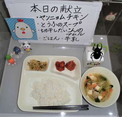食材には、おもにエネルギーのもとになる黄色の食べ物が5種類、おもに体をつくるもとになる赤色の食べ物が4種類、おもに体の調子を整える緑色の食べ物が8種類使用されています。