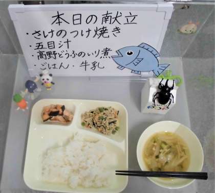 食材には、おもにエネルギーのもとになる黄色の食べ物が3種類、おもに体をつくるもとになる赤色の食べ物が7種類、おもに体の調子を整える緑色の食べ物が7種類使用されています。