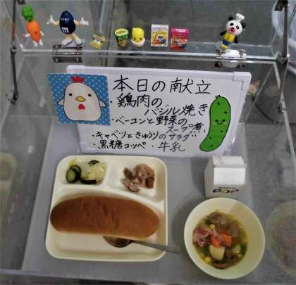 食材には、おもにエネルギーのもとになる黄色の食べ物が5種類、おもに体をつくるもとになる赤色の食べ物が3種類、おもに体の調子を整える緑色の食べ物が6種類使用されています。