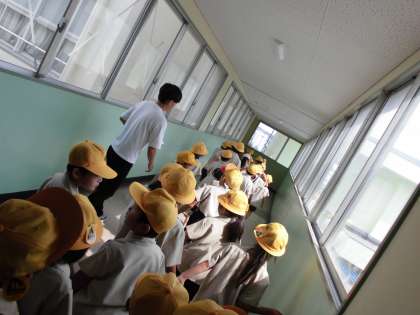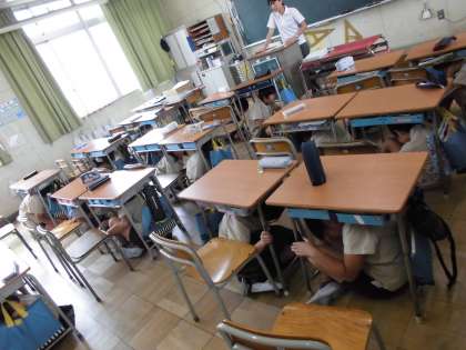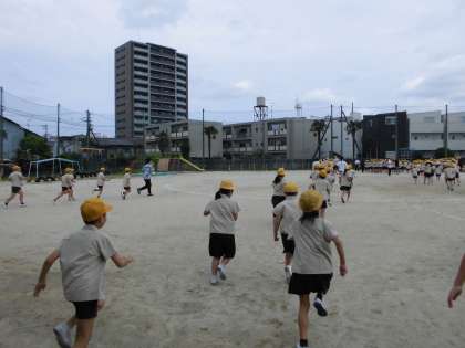 南海沖を震源とした地震が発生。その後津波警報が発令したと想定して、避難訓練を行いました。今日のいつ避難訓練があるとは子ども達に伝えないで行いました。教室で、身を守る行動をとり、運動場へ地震に対する避難をし、3階以上の部屋へ津波からの避難をしました。