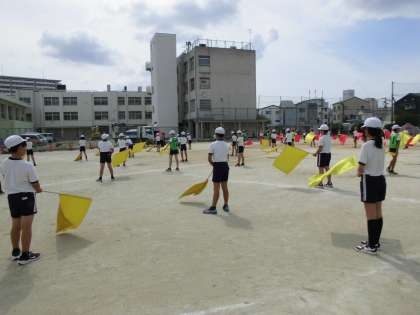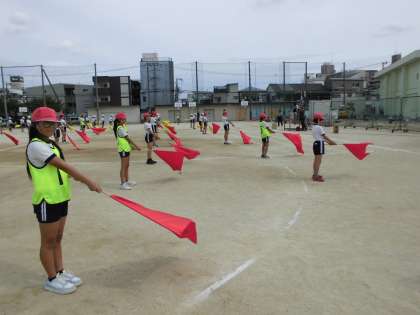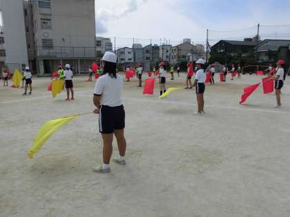 体育館でプロジェクターを見て旗を振る演技を覚えてきましたが、運動場では体形を整えて旗を振るタイミングを合わせました。赤と黄色のカラフルな様子がとてもいいです。