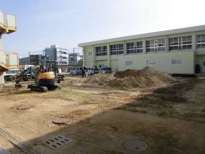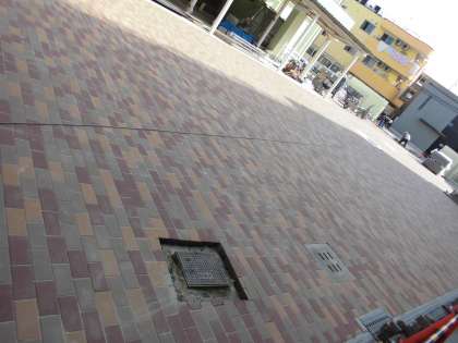 講堂の中の工事は終わっていますが、外周りの工事が竣工式に向けて急ピッチに進められています。講堂入り口には、以前藤棚があったのですが、今回の工事で写真のように美しいレンガが敷きつめられています。