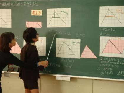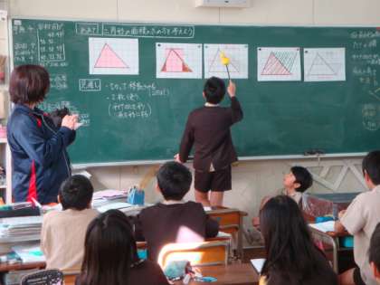単元は「四角形と三角形の面積」で、既習の面積の求め方をもとに、三角形の面積の求め方を考えました。