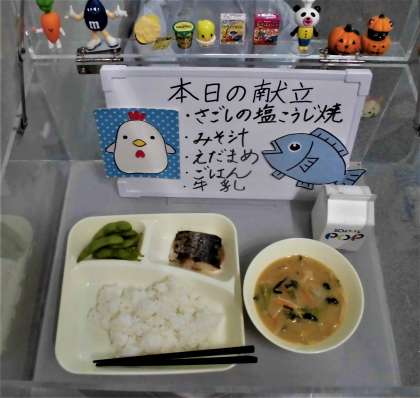食材には、おもにエネルギーのもとになる黄色の食べ物が1種類、おもに体をつくるもとになる赤色の食べ物が7種類、おもに体の調子を整える緑色の食べ物が6種類使用されています