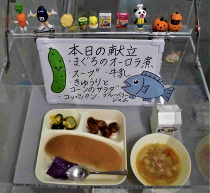 食材には、おもにエネルギーのもとになる黄色の食べ物が7種類、おもに体をつくるもとになる赤色の食べ物が4種類、おもに体の調子を整える緑色の食べ物が6種類使用されています。