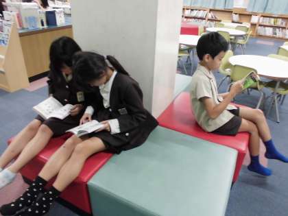 図書委員会児童が、給食時間の放送で図書館が開いていることを知らせます。火曜日と木曜日の昼休みが開放の日です。今日は、10人ぐらいの子どもたちが熱心に読書をしていました。