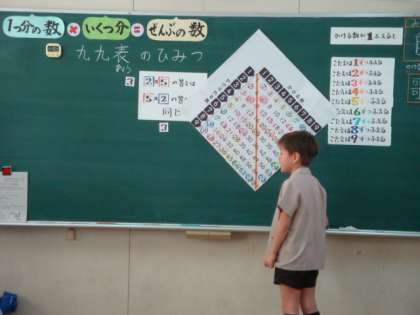 まず、九九の表で同じ答えになる所を見つけ、気づいたことを発表しています。