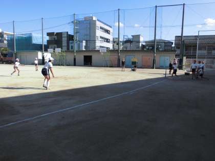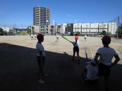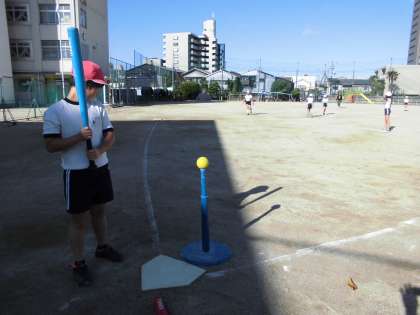 ティーバッティングは固定したボールをバットで打ちます。野球のように4つのベースがあり、一つのベースを踏むと1点です。ホームランを打つと4点になります。動かないボールでも打つのはなかなか難しいです。大きいあたりが出ると「おおっ!」という歓声があがっていました。