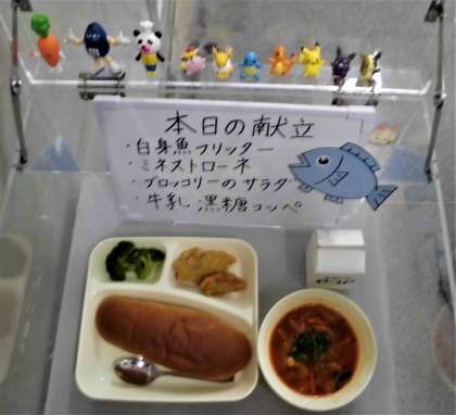 食材には、おもにエネルギーのもとになる黄色の食べ物が5種類、おもに体をつくるもとになる赤色の食べ物が3種類、おもに体の調子を整える緑色の食べ物が7種類使用されています。