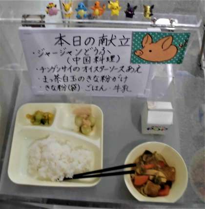 食材には、おもにエネルギーのもとになる黄色の食べ物が5種類、おもに体をつくるもとになる赤色の食べ物が5種類、おもに体の調子を整える緑色の食べ物が11種類使用されています。