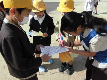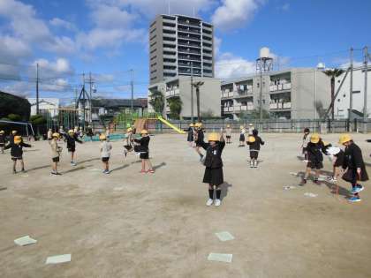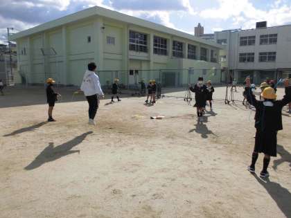 今日から22日金曜日までなわとび週間「カガリンピック」です。なわとび運動を通して体力の向上をはかります。一人一人が目標をもち、「がんばりカード」を活用します。ビブスを着用しているのが運動委員会児童で「がんばりカード」に印をつけたり困っている子を助けたりしていました。