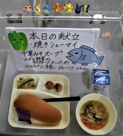 食材には、おもにエネルギーのもとになる黄色の食べ物が3種類、おもに体をつくるもとになる赤色の食べ物が6種類、おもに体の調子を整える緑色の食べ物が4種類使用されています。