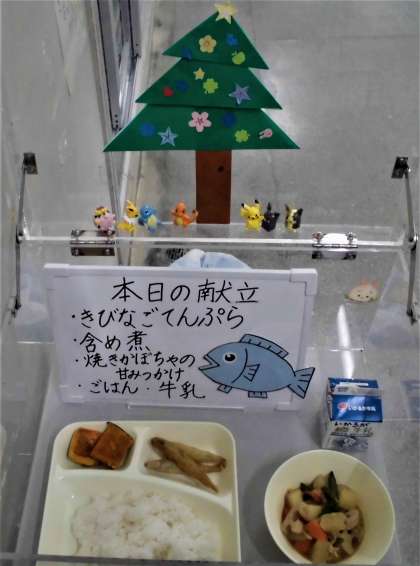 食材には、おもにエネルギーのもとになる黄色の食べ物が4種類、おもに体をつくるもとになる赤色の食べ物が4種類、おもに体の調子を整える緑色の食べ物が6種類使用されています。