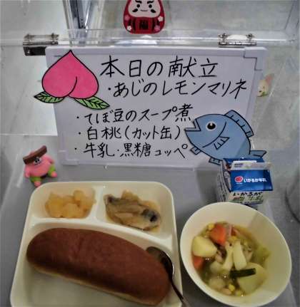 食材には、おもにエネルギーのもとになる黄色の食べ物が6種類、おもに体をつくるもとになる赤色の食べ物が5種類、おもに体の調子を整える緑色の食べ物が7種類使用されています。