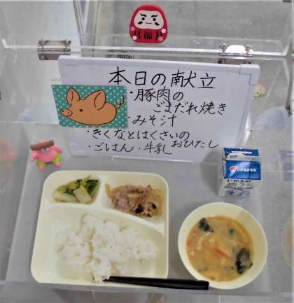 食材には、おもにエネルギーのもとになる黄色の食べ物が4種類、おもに体をつくるもとになる赤色の食べ物が7種類、おもに体の調子を整える緑色の食べ物が6種類使用されています。