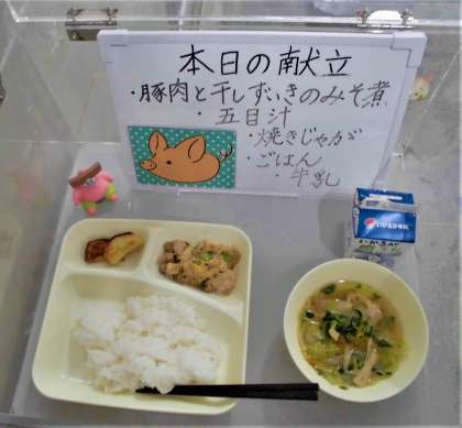 食材には、おもにエネルギーのもとになる黄色の食べ物が4種類、おもに体をつくるもとになる赤色の食べ物が7種類、おもに体の調子を整える緑色の食べ物が7種類使用されています。